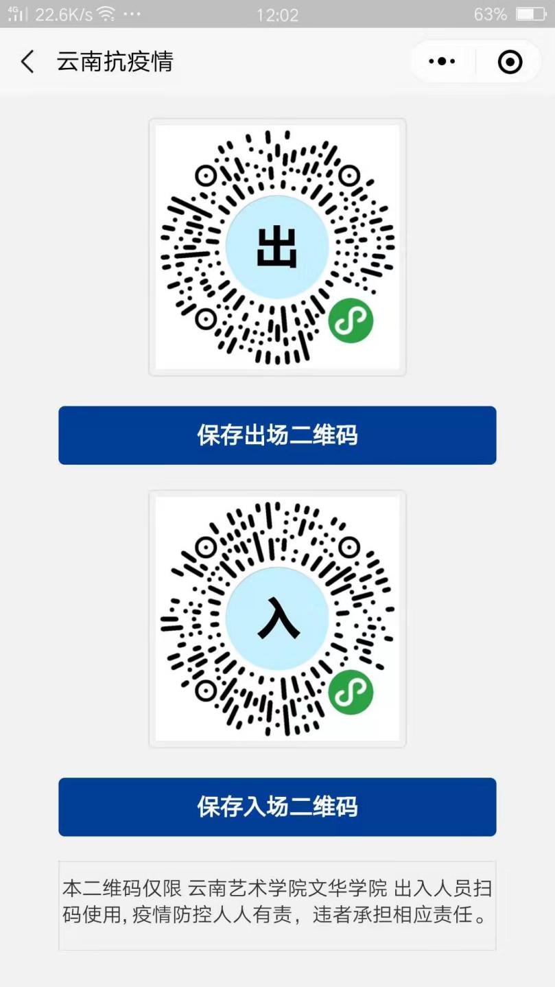 2.云南艺术学院文华学院在呈贡校区入口和出口对应张贴“云南抗疫情”二维码,并监督院校师生、相关人员在入、出学校时扫描二维码登记信息。