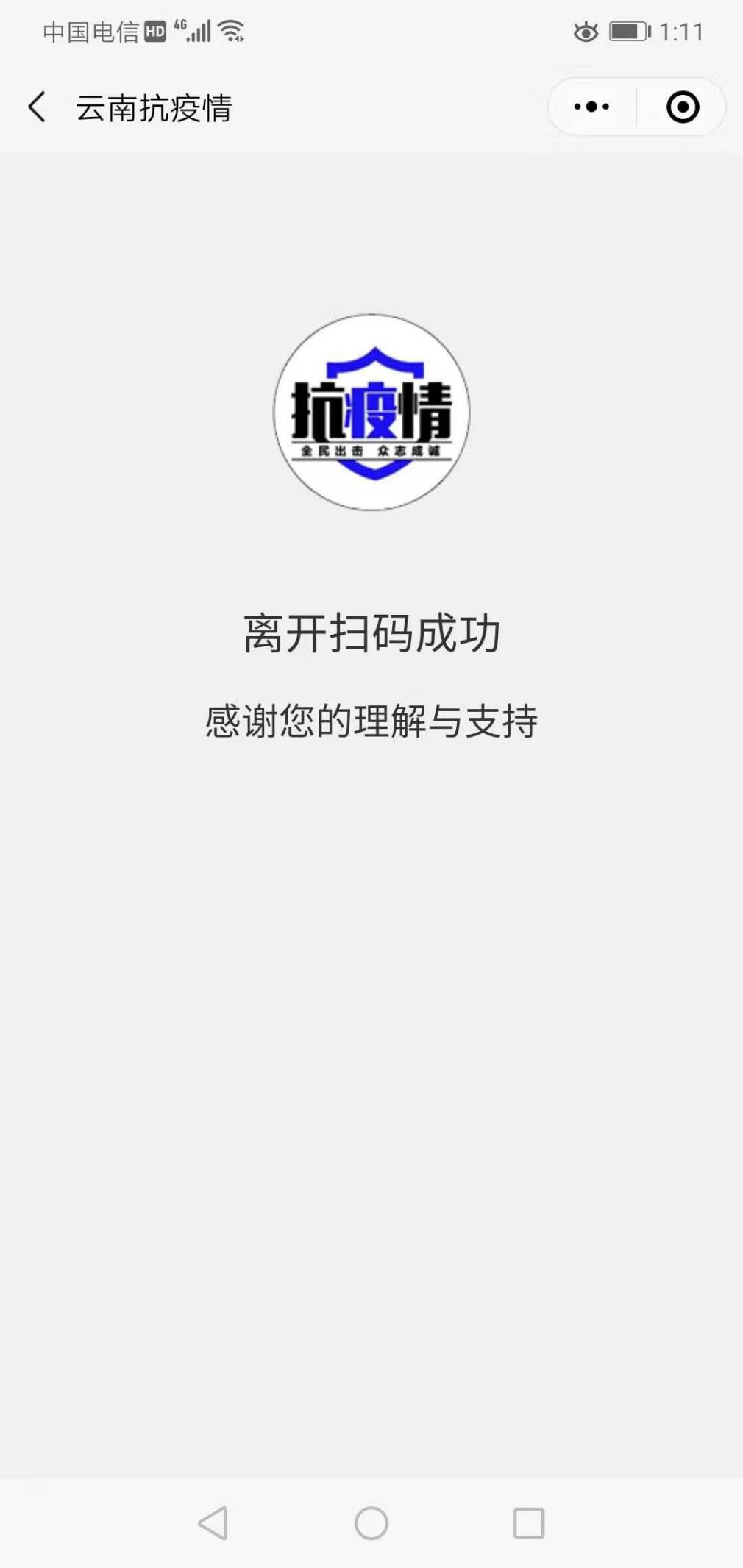 3、如果已经完成手机短信验证,之后直接扫码登记即可。扫码登记完成系统分别提示进入扫码成功和离开扫码成功。