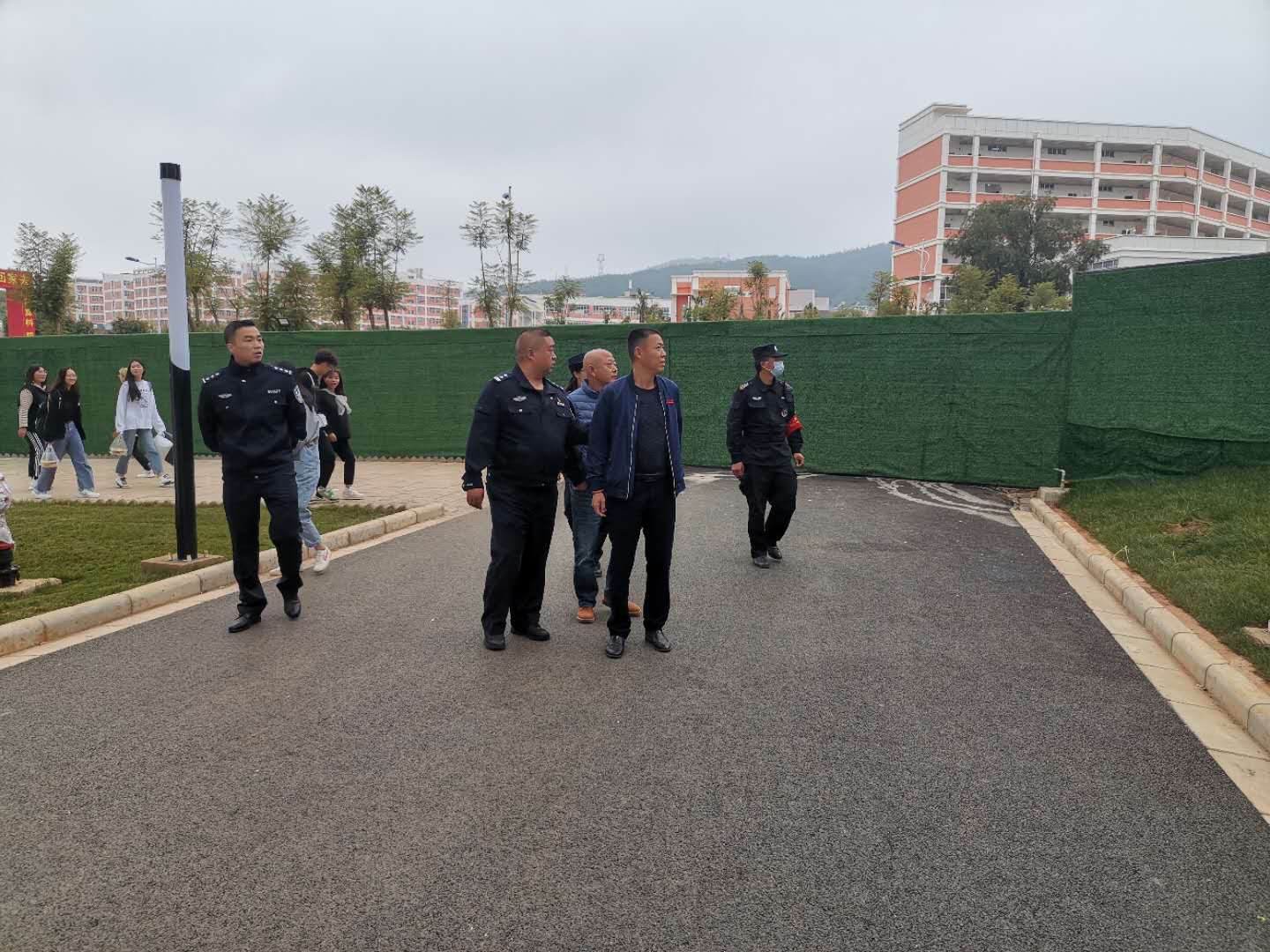 李所长一行首先到2020级新生宿舍通过实地对周边环境,门卫值班管理,校园监控布防,在建项目工地人员基本信息及日常安全管理等方面进行了全方位认真仔细检查。之后,双方就如何进一步加强校园周边治安环境工作、安全警示教育工作等方面进行深入的交流。在交流中派出所李春富所长谈到了,要加强与派出所及属地行政部门的联系,联合各方力量,大力整治净化校园及周边环境,确保校园安全稳定。针对近期电信诈骗发案呈上升趋势的现象要加强安全教育宣传,增强学生安全意识,提高学生安全防范能力,积极推行“金钟罩”APP ,同时加大校园监控安装进度切实保障师生的生命财产安全。