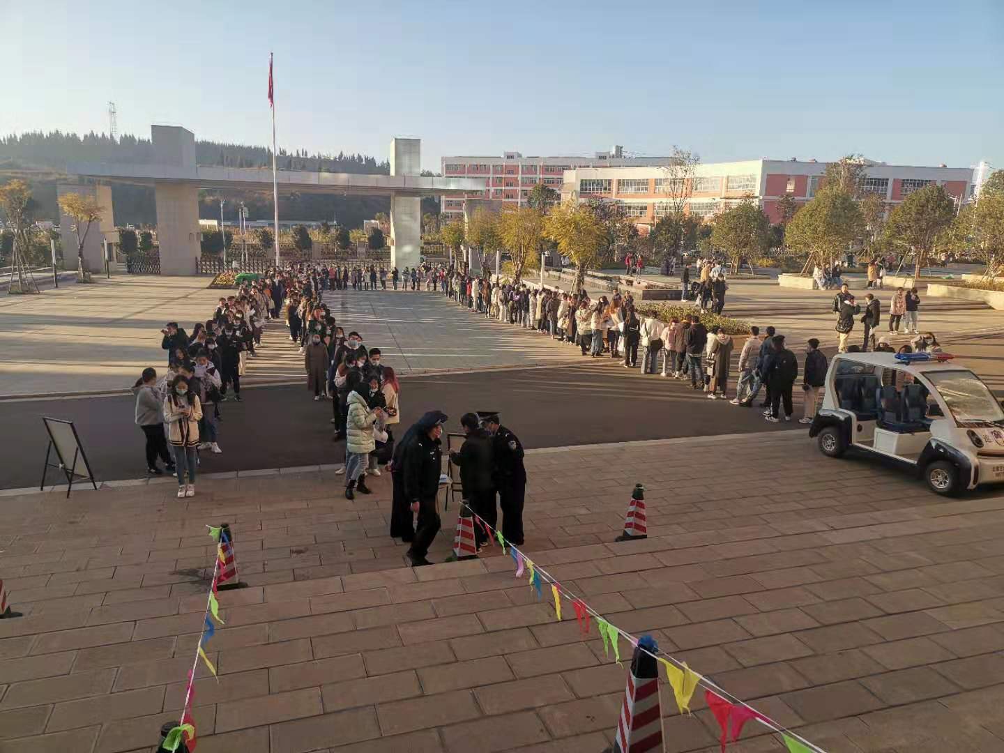本次考试处于疫情防控期间,保卫处严格执行学校疫情防控要求,考前明确各岗位工作职责,分别设置了“扫码”、测温通道,考场周边设置醒目警戒线,同时加大考场周边的技防、人防巡逻力度,确保考场外围环境安全。