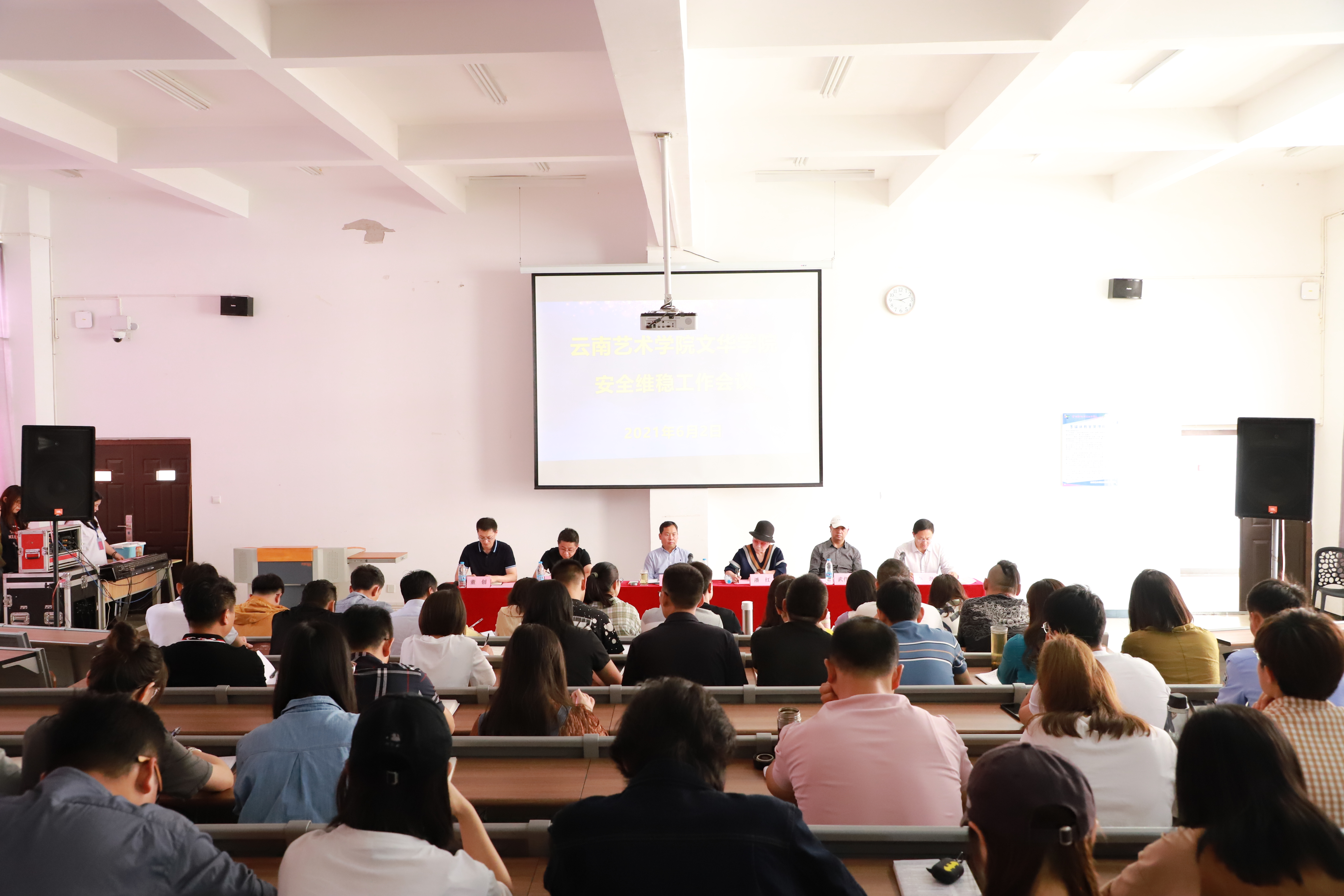 6月2日早上9时,云南艺术学院文华学院安全维稳工作会议在亦归楼D104阶梯教室召开。校长潘红,党委书记朱发刚,党委副书记武作健,副校长李兆宇、李劲,校长助理董创出席了会议,学校各职能部门、二级学院负责人、辅导员参加了会议,会议由党委书记朱发刚主持。