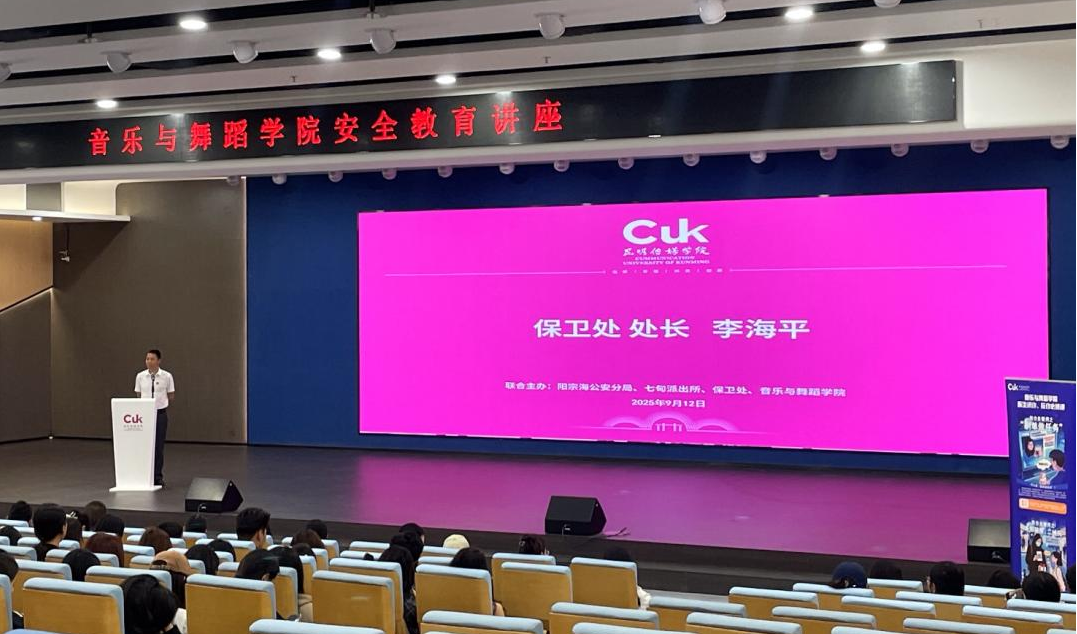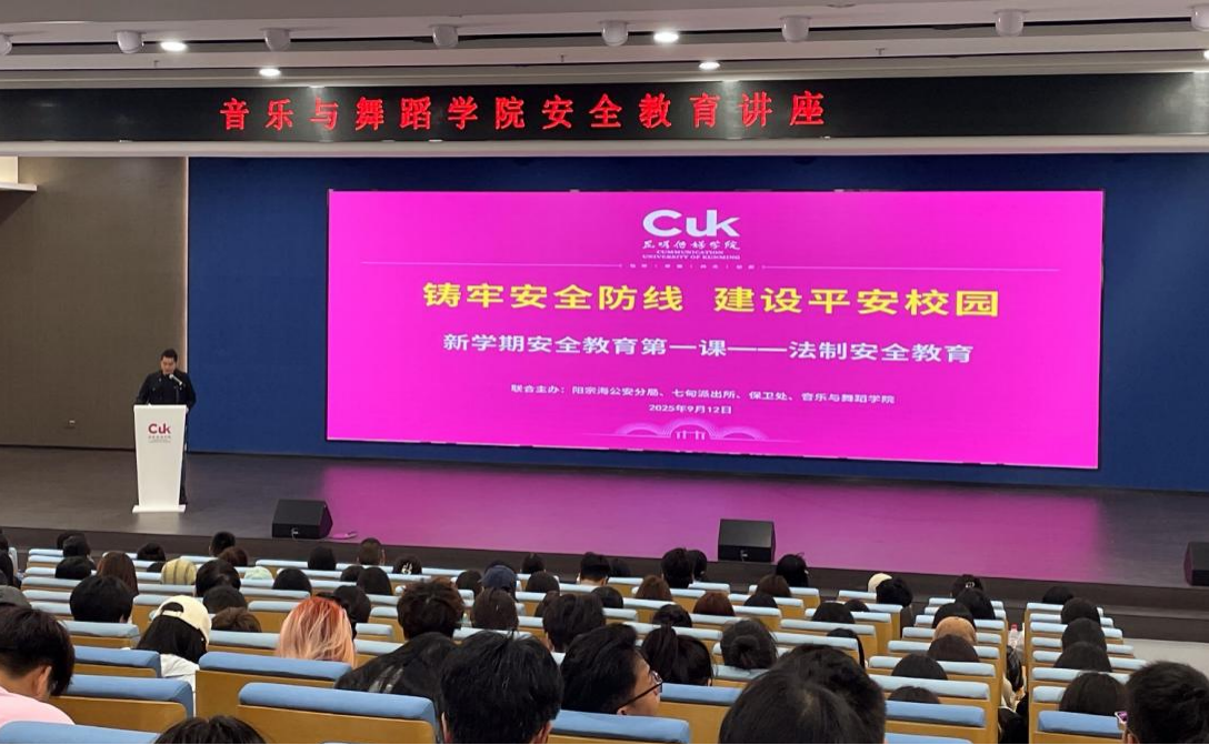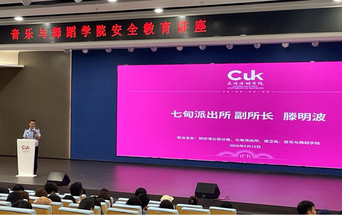 为强化学生安全意识、提升自我保护能力。2025年9月12日,音乐与舞蹈学院联合保卫处邀请七甸派出所为新生进行新学期安全教育第一课,七甸派出所副所长滕明波、女子反诈宣传小队,院长罗跃斌、保卫处全体人员、学院辅导员及全体新生参会,会议由副院长田雨主持。