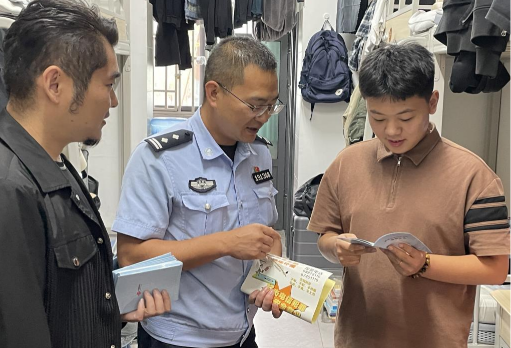 讲座结束后,派出所民警与参会教师前往10、11、12栋学生宿舍,通过发放反诈手册、现场讲解安全知识,进一步巩固讲座效果;同时引导学生下载“金钟罩”与国家反诈APP,粘贴防范刷单警示宣传贴纸,将安全教育从“课堂”延伸至“生活”,切实筑牢学生安全防护网,为其安心学习、追逐艺术梦想提供保障。