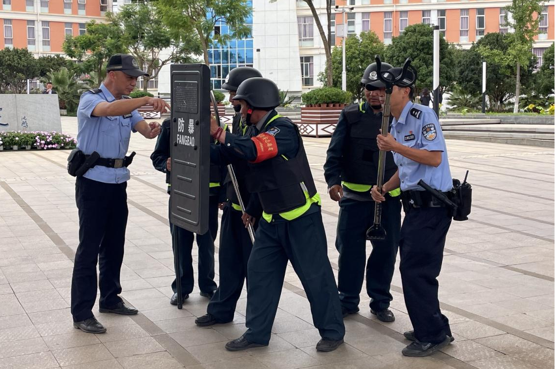培训伊始,七甸派出所民警刘献结合近年来典型案例,深入浅出讲解了暴恐事件的识别方法、预警信号及应急处置核心流程,强调了保安队伍作为校园安全“第一道防线”的关键作用。在器械实操环节,民警重点演示了防暴盾牌、钢叉、警棍等装备的使用技巧,细致拆解“持握、格挡、配合、控制”等关键动作要领,并指导队员分组练习“最小作战单元”战术配合,确保人人熟练掌握装备使用技能。